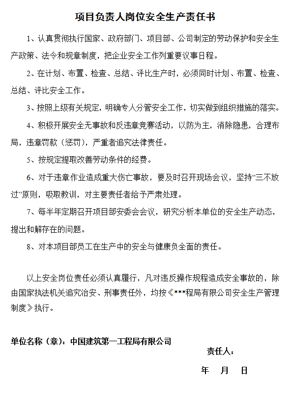 项目部各级人员岗位安全责任书(无表式) GDAQ20201 无表式—内容没有固定格式,可以自由发挥,不能偏离主题。 声明:本站所有文章,如无特殊说明或标注,均为本站原创发布。任何个人或组织,在未征得本站同意时,禁止复制、盗用、采集、发布本站内容到任何网站、书籍等各类媒体平台。如若本站内容侵犯了原著者的合法权益,可联系我们进行处理。