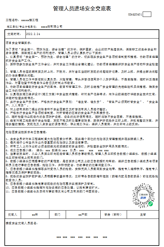 管理人员进场安全交底表GDAQ20401 声明:本站所有文章,如无特殊说明或标注,均为本站原创发布。任何个人或组织,在未征得本站同意时,禁止复制、盗用、采集、发布本站内容到任何网站、书籍等各类媒体平台。如若本站内容侵犯了原著者的合法权益,可联系我们进行处理。